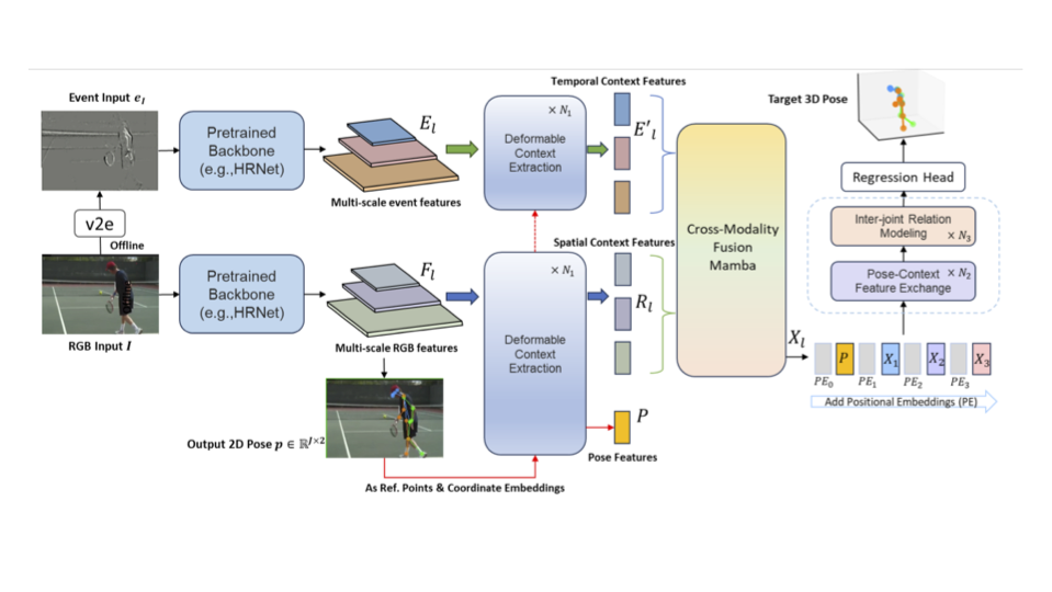3D human pose estimation (HPE) is an important computer vision task with various practical application. Existing 3D HPE methods rely on lifting 2D pose sequence to 3D which do not perform well. We propose a framework that incorporates event stream as an additional input since event features provide useful information. In addition, our framework uses intermediate visual representation produced by off-the-shelf 2D pose detectors to implicitly encode joint-centric spatial contenxt. Our framework uses a novel state-space model-based solution called CA-MambaPose. This work is published in a WACV 2025 paper.
