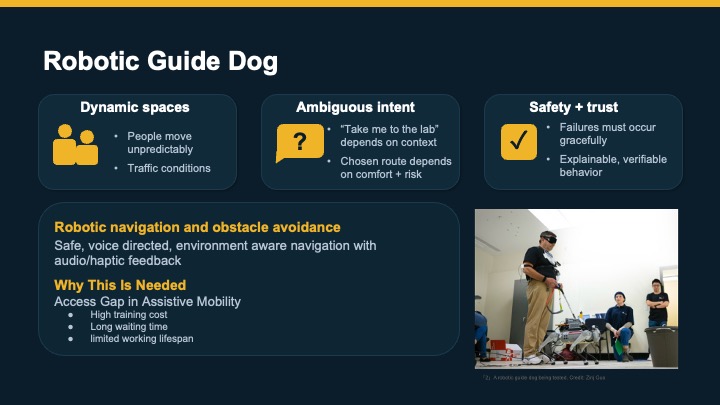 People with Low Vision face difficulties to live independently. They need help understanding their environments while they are doing grocery shopping or at home as they move around. In this project, we explore VLM-guided semantic navigation on a Unitree Go2 robot that provides such feaatures. Users can interact with the robotic guide dog via languages.